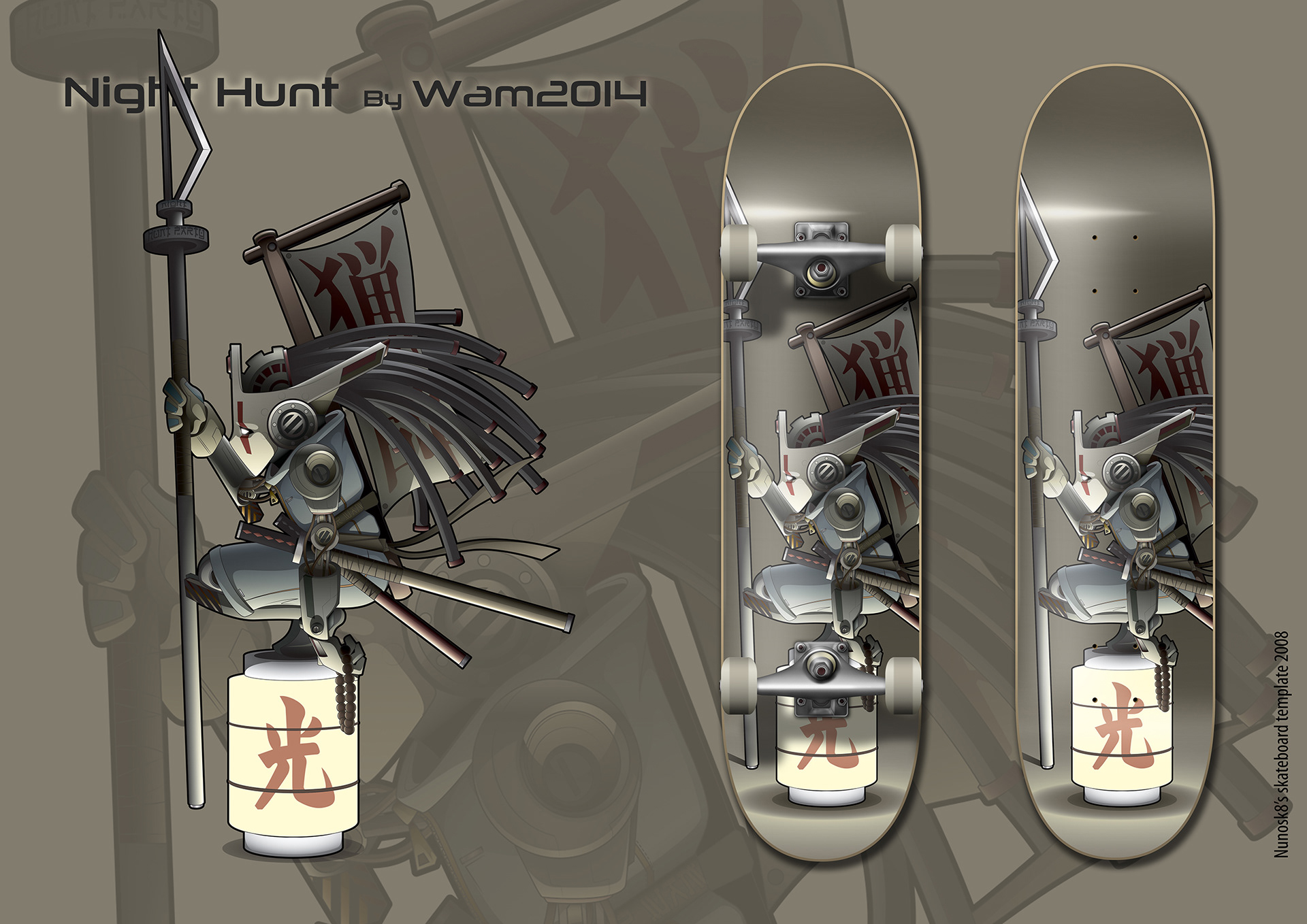 skateboard design inspired by "Night Hunt" vector artwork, Wam2014